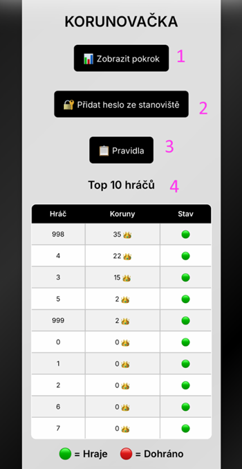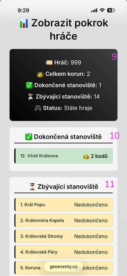 9 – statistiky daného hráče (jméno, celkem získaných Korun, počet dokončených stanovišť, počet chybějících stanovišť a informace, zda stále hraje)