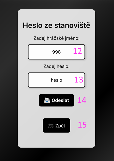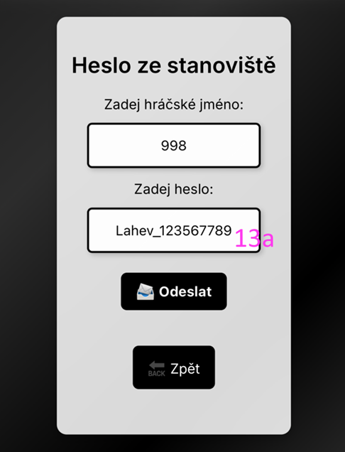 13 – zadání hesla ze stanoviště ( 13a – na stanovišti č. 7 se odhad zadává ve formátu lahev_odhad)