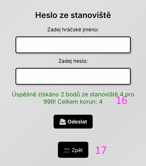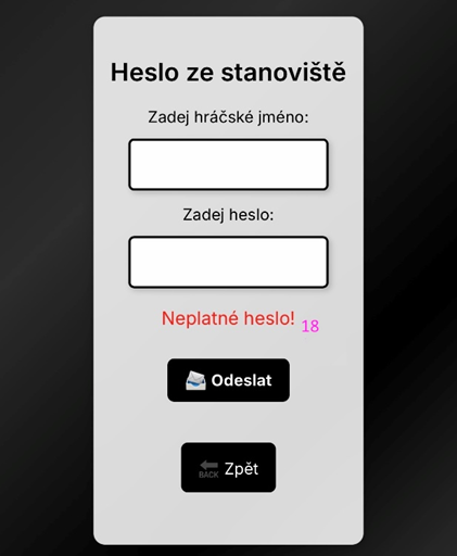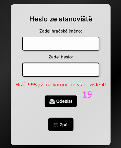 19 – při opětovném pokusu o zadání hesla na již vyřešeném stanovišti se objeví upozornění
